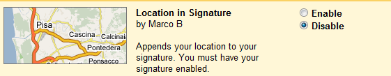 Ook Gmail moet er aan geloven en geeft nu in de 'labs' sectie de mogelijkheid om je huidige locatie in je email ondertekening op te nemen: